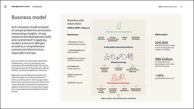 ALK’s business model is illustrated in a simple and easy-to-understand way showing both the internal processes, the resources used, and the results created in 2024.