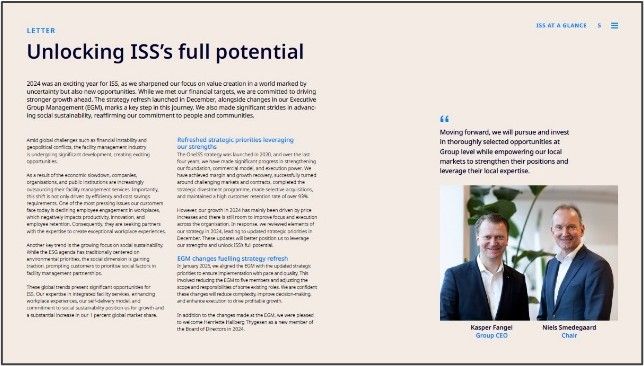 The CEO and Chair of ISS are describing the results and value creation achieved in 2024 but also use the letter to explain the transformation of the company and business.
