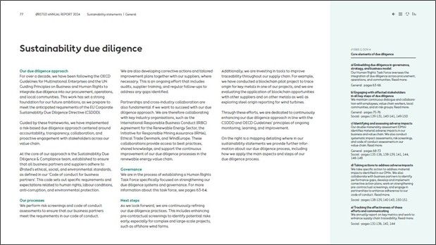 Ørsted describes the due diligence processes related to sustainability. Also, there is reference to due diligence elements included in different parts of the report.