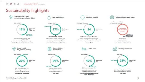 Rockwool illustrates its goals and progress on eight ESG performance indicators/highlights in very simple and decodable way.