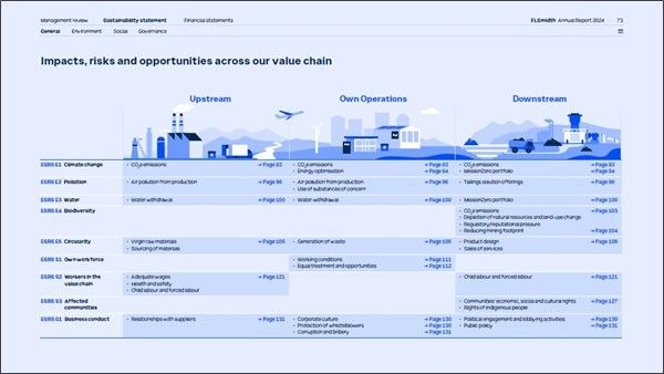 FLSmidth determines the location of the impacts, risks and opportunities in the value chain. This makes the focus on all parts of the value chain very illustrative.